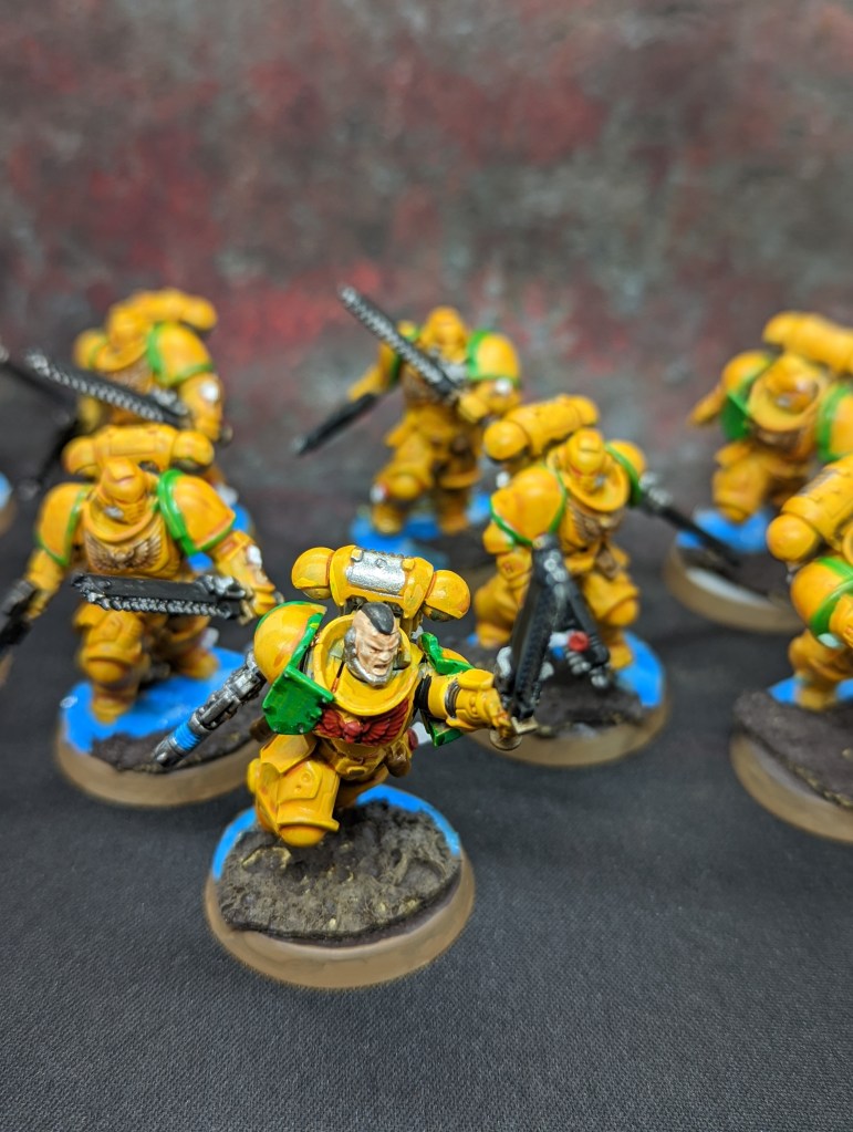 Not going to lie, I hate painting primaris marines. They have too many little details which add nothing other than to make things a pain to paint. Also, this team were the ones i was working on when my dad died so I had started them again by a straight spray over.