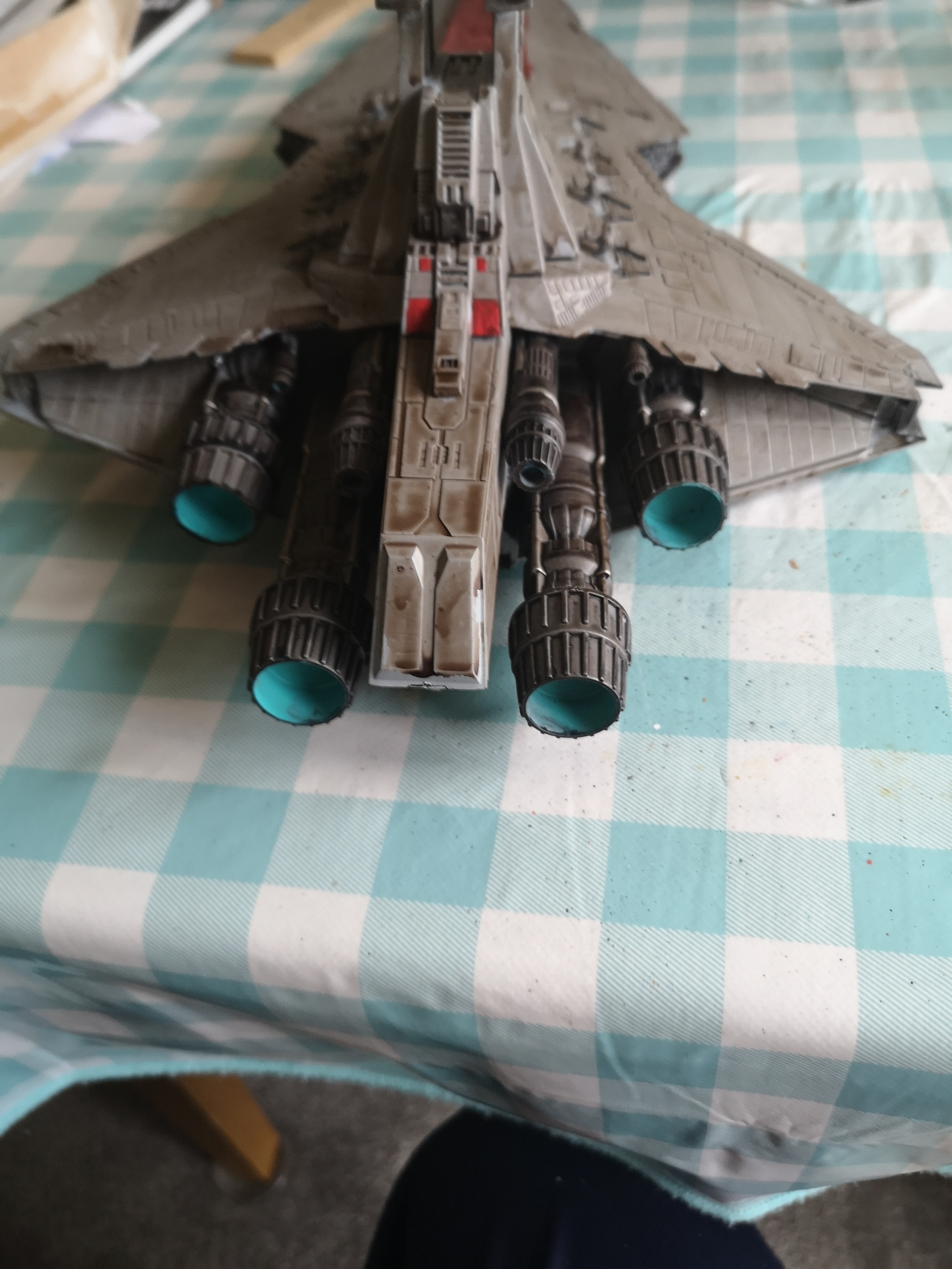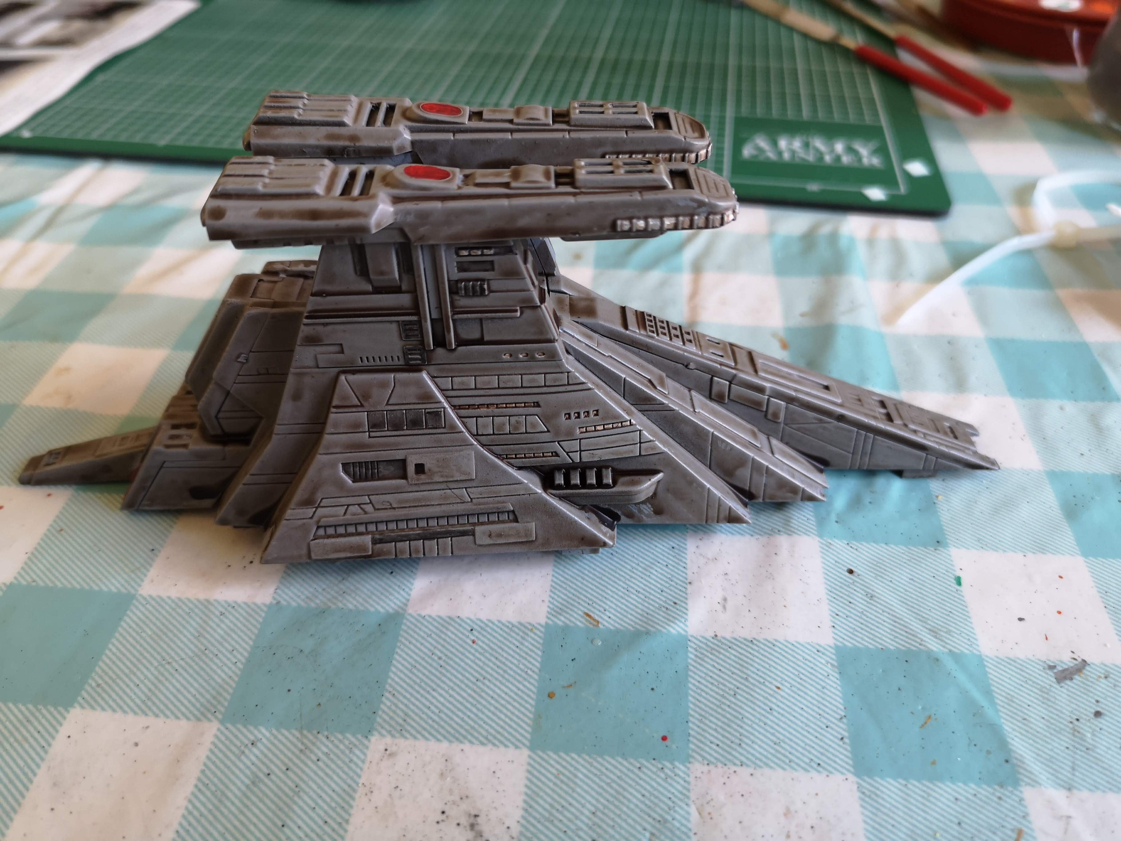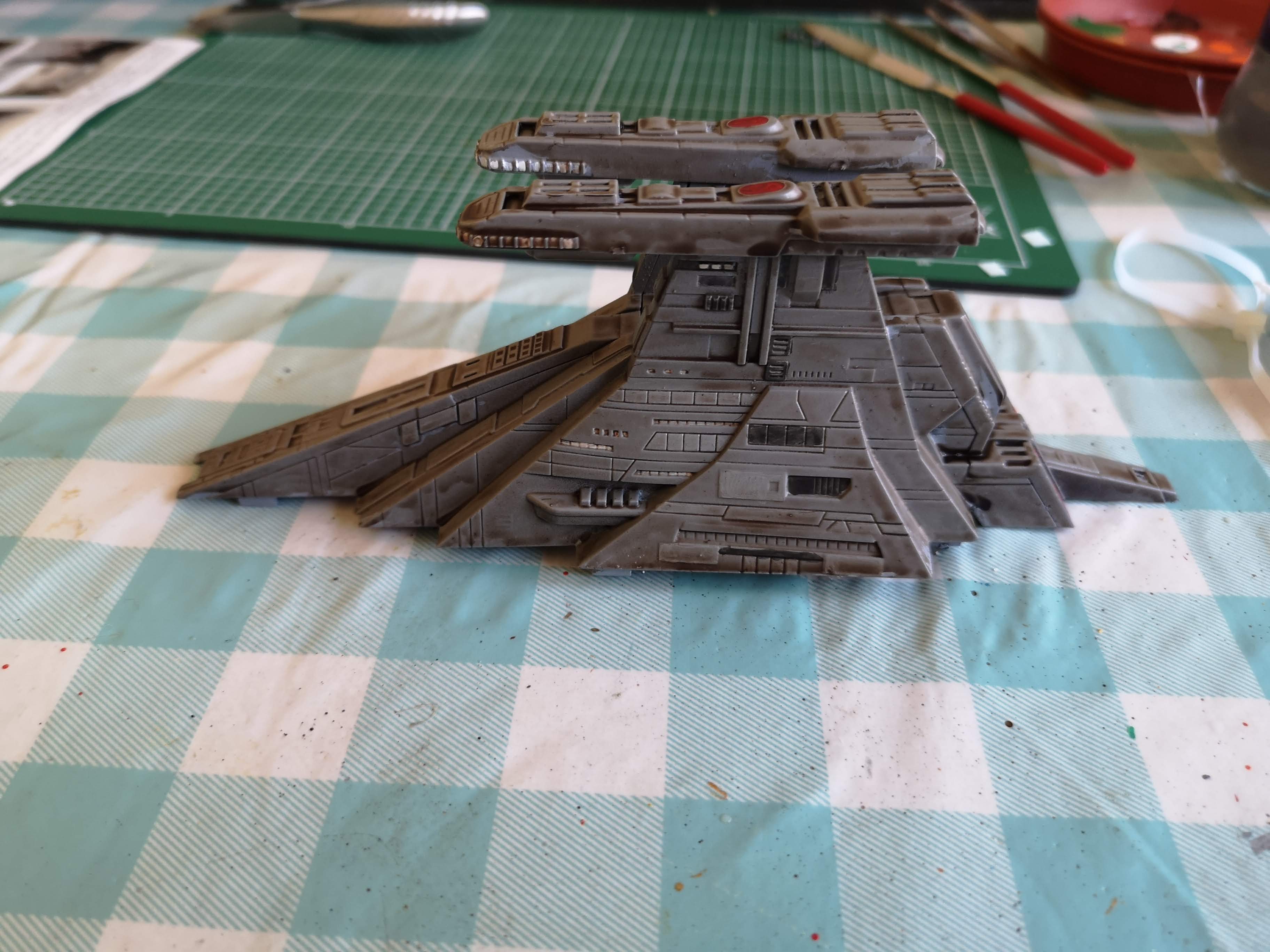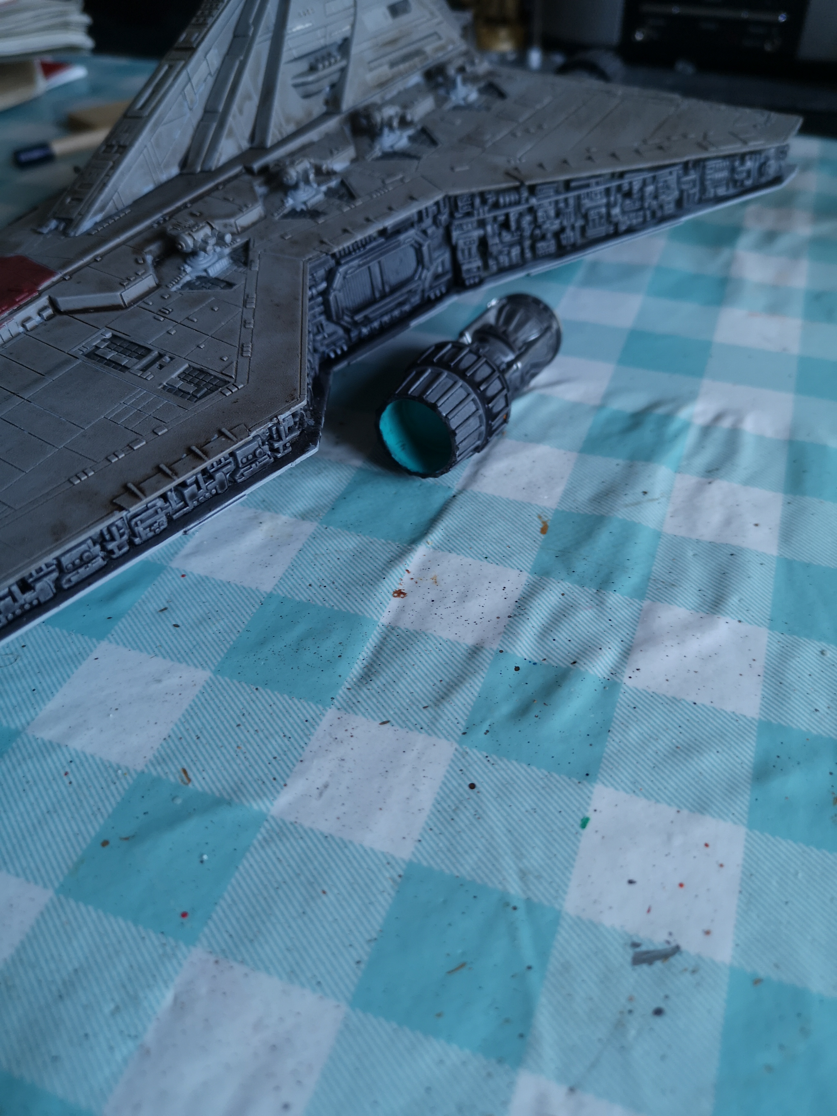 So the venator is coming along nicely now. The army painter strong tone wash really lifted the hull beyond my expectations. I did try using different shades of grey but it did nothing (other than the humbrol dark). The strong tone was a bit last resort to give some character but I am really pleased with how it looks. Engines are about half done and I am doing some detailing on the lower hull next.