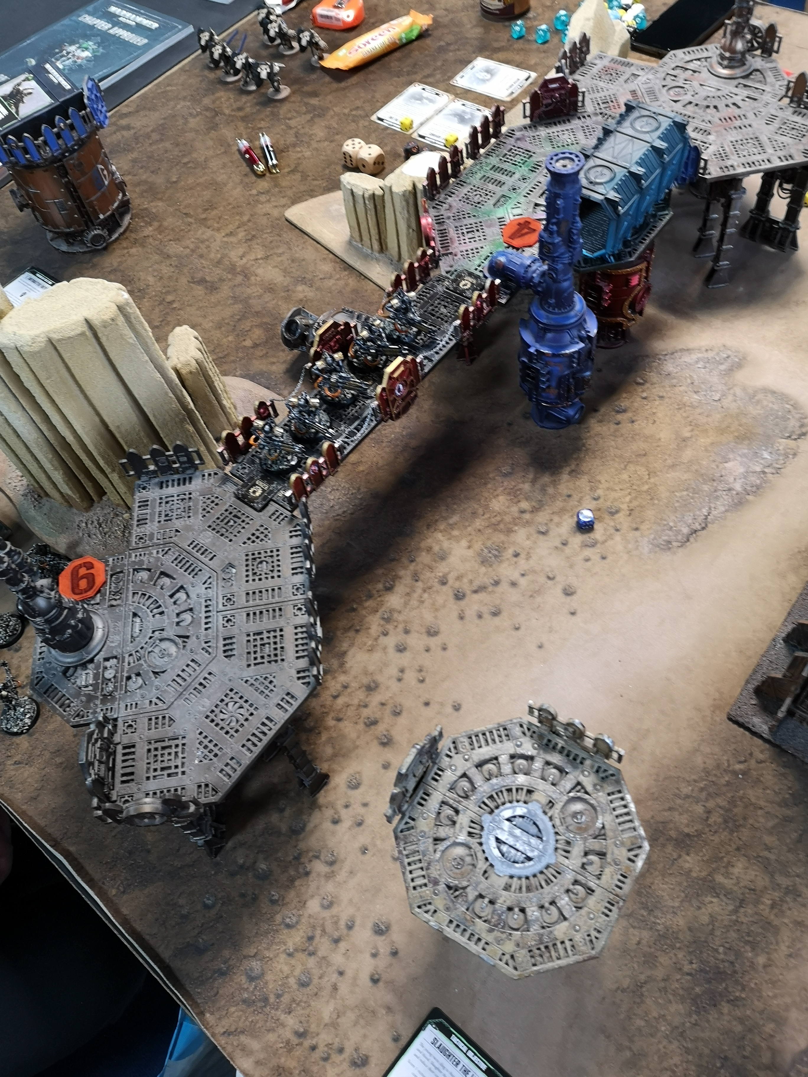 Markers six, three and two were on my side of the board (two in the building on the right on the first floor) and six on the top of the gantry on the right. Five was in the building on the top right and one was behind a container. In essence we both controlled three markers each.