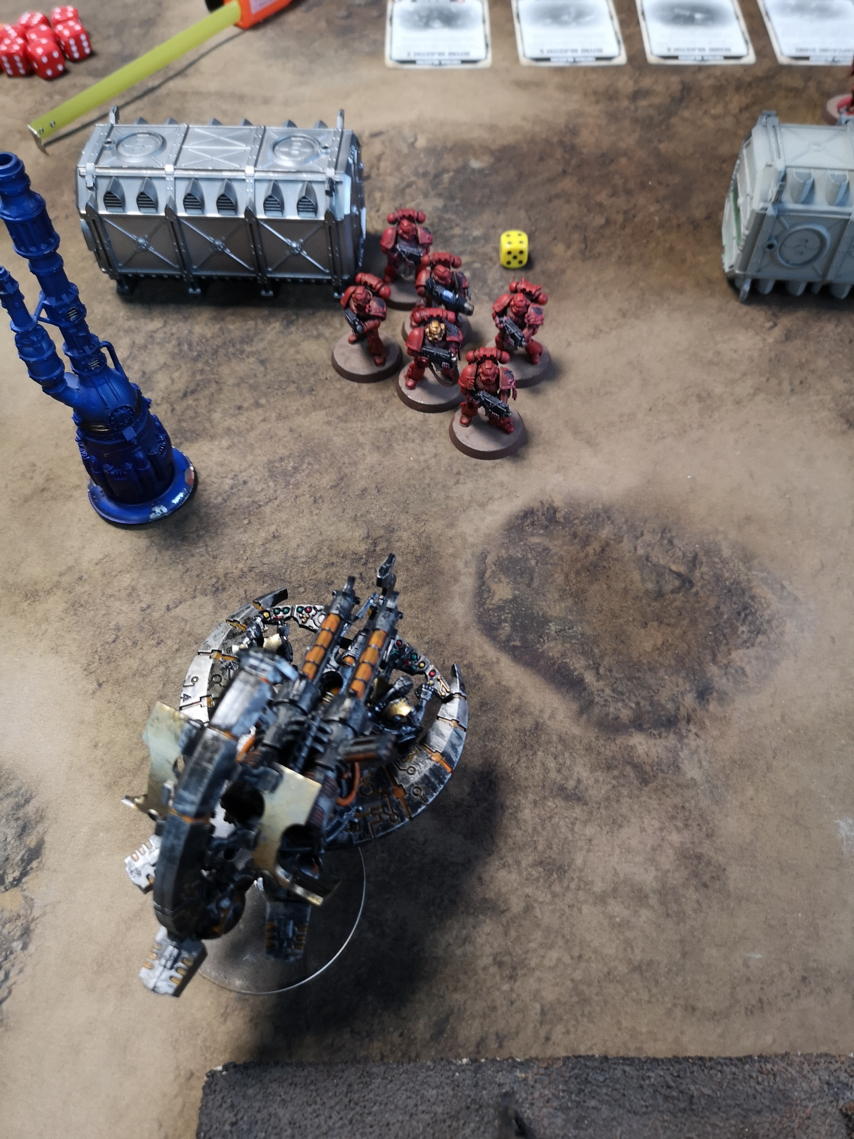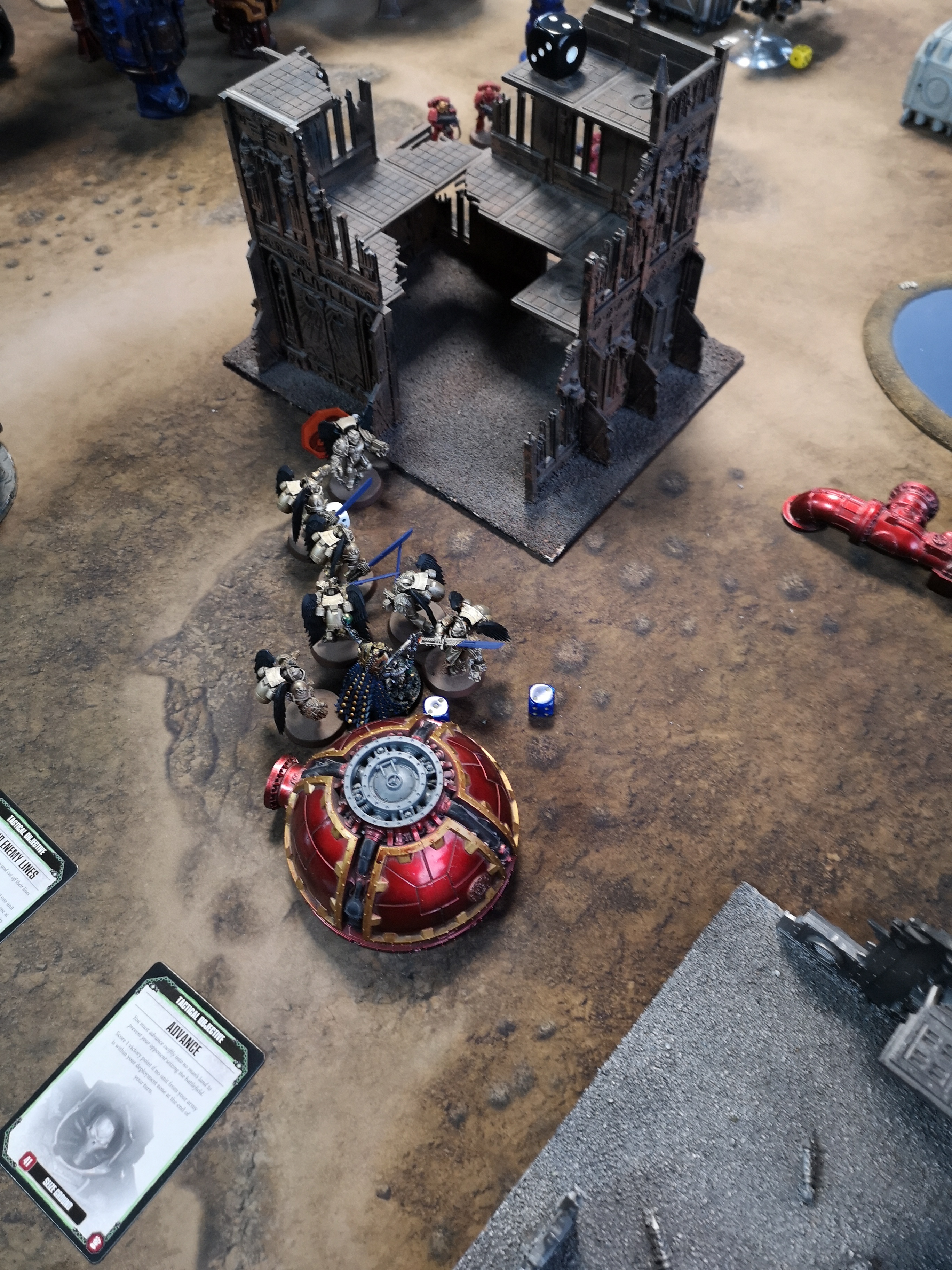 Things had by now become quite fragmented. Both sides had forces all over the board but the necrons retained a large concentration in Jon’s deployment zone. Jon had the objective cards of capture objective six, defend objective five and assassinate. I allowed slay the assassinate to count as two on the basis that he was going to get objective five anyway. The captain scooted away into cover and in a surprise move the sanguinary guard fell back from combat into the cover of the building in the centre of the map. The shooting phase saw a destroyer loose a wound to the tactical marine’s heavy bolter whilst the overlord lost another wound to the guard’s bolters.