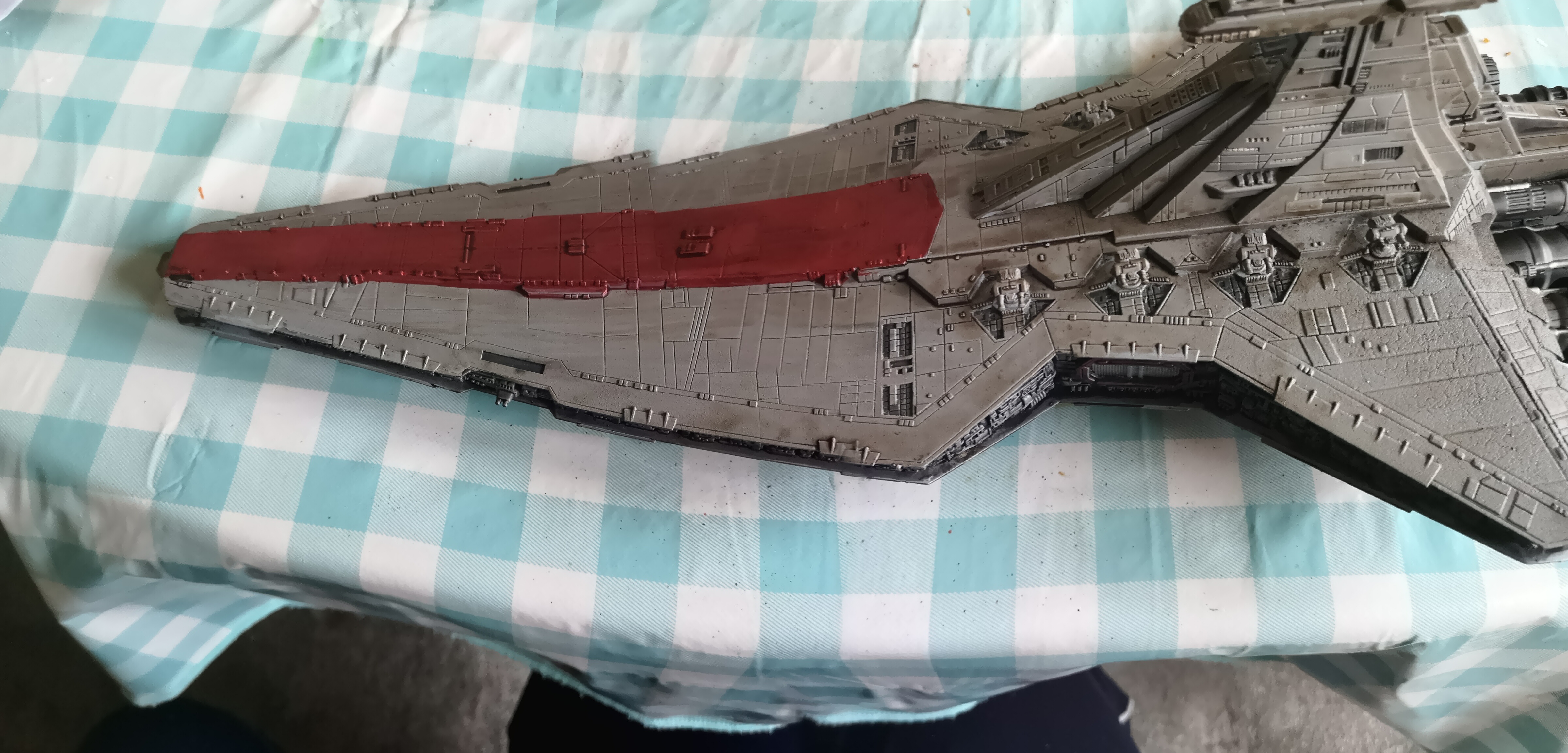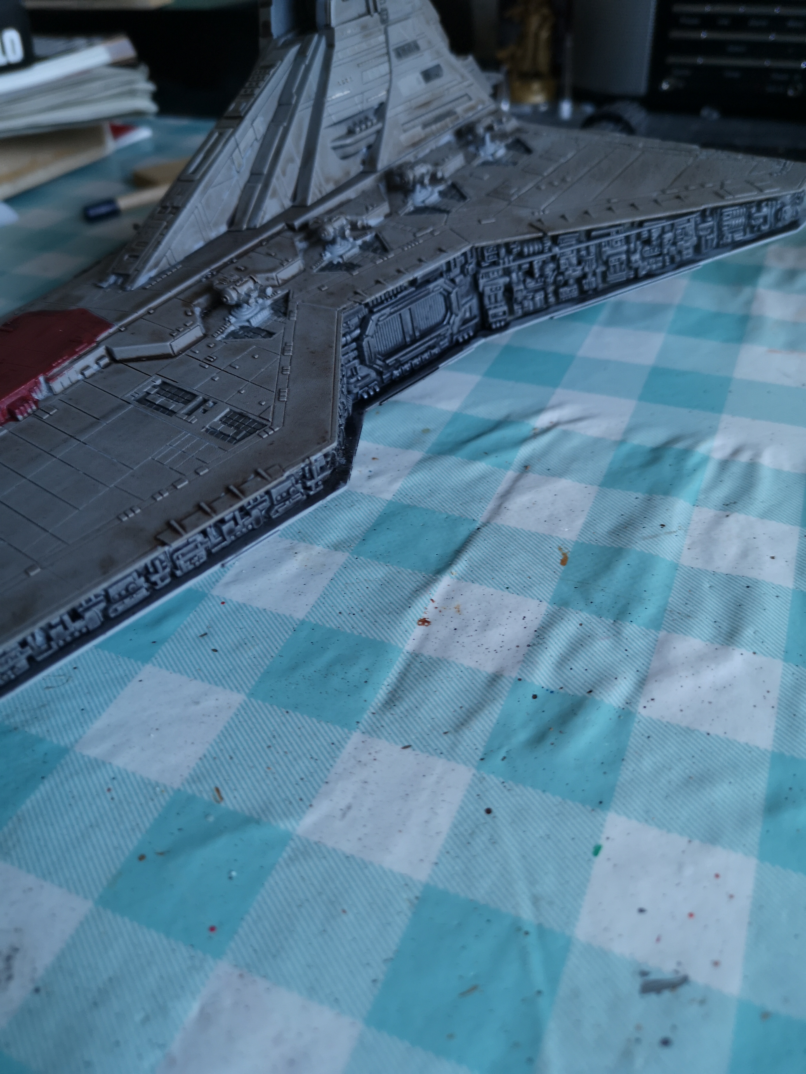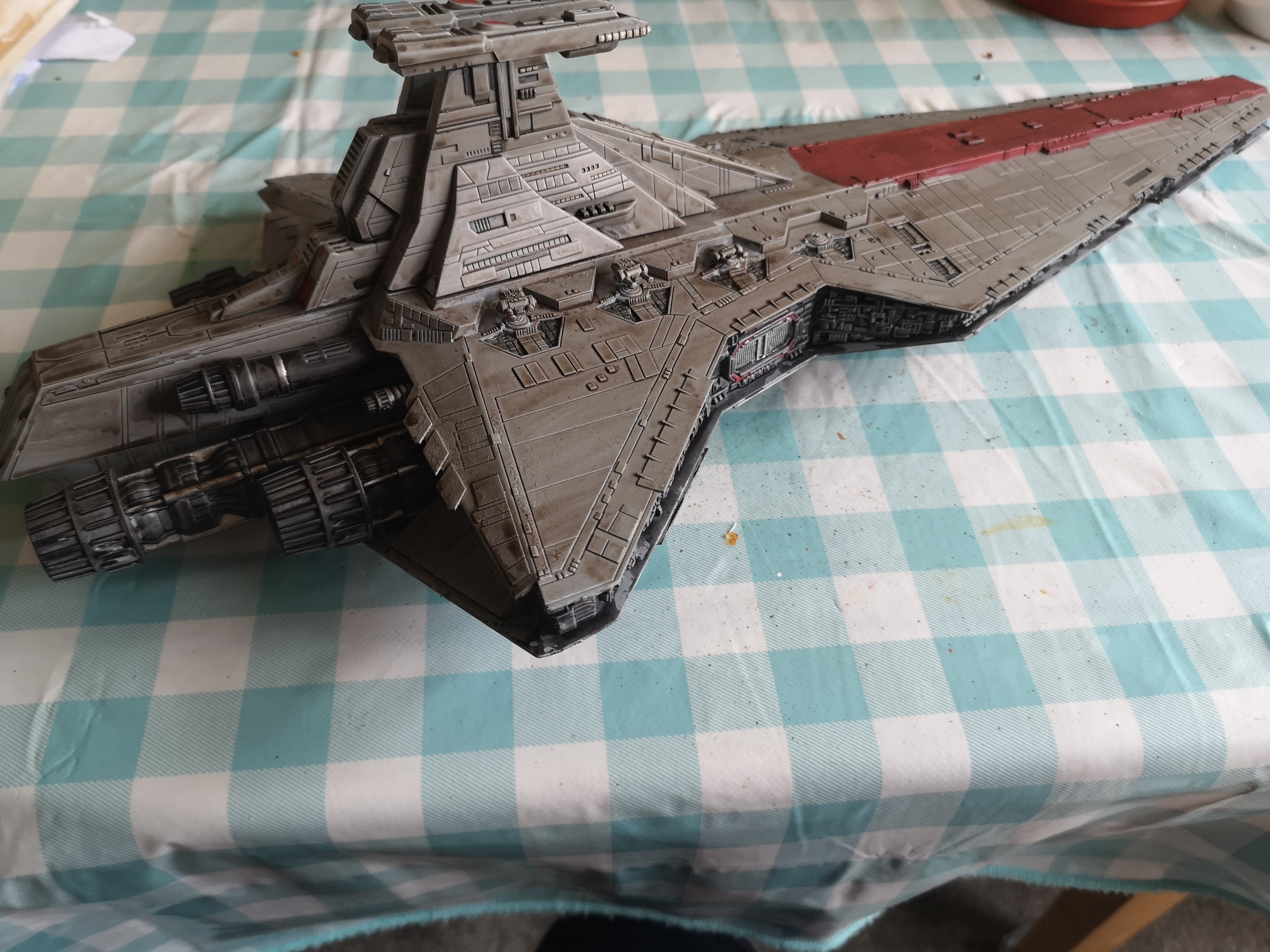 So February’s project on the modelling front is to finish the Revell Venator Star Destroyer from Revenge of the Sith and the Clone Wars series. This was always my favourite version of the Star Destroyer class ships which you see across the saga and I saved for ages for the model when it came out. Resources at the time and other matters meant I base coated it and then completely forgot about it until I moved home. Clearing the loft at my parents resulted in it being unearthed.