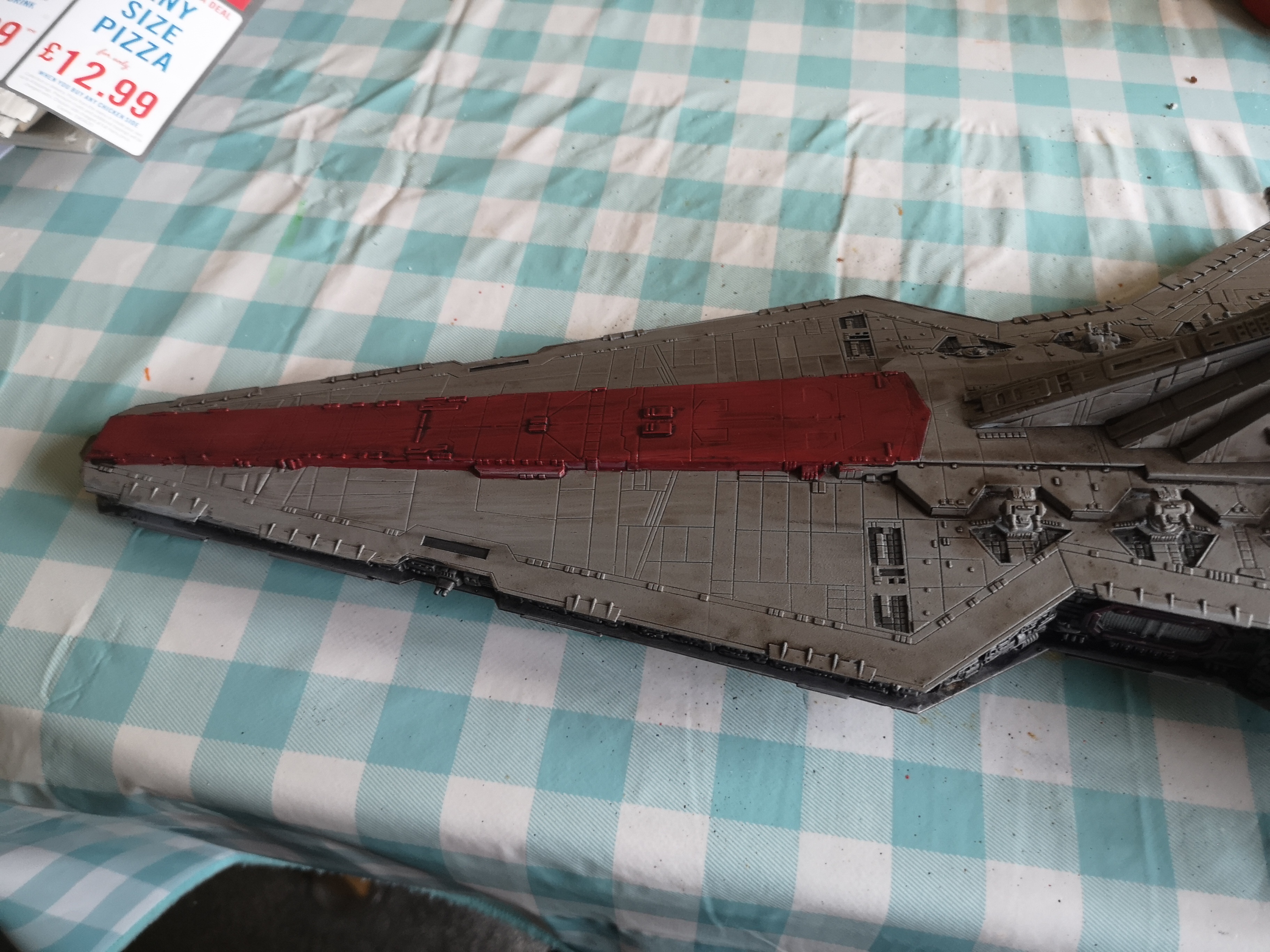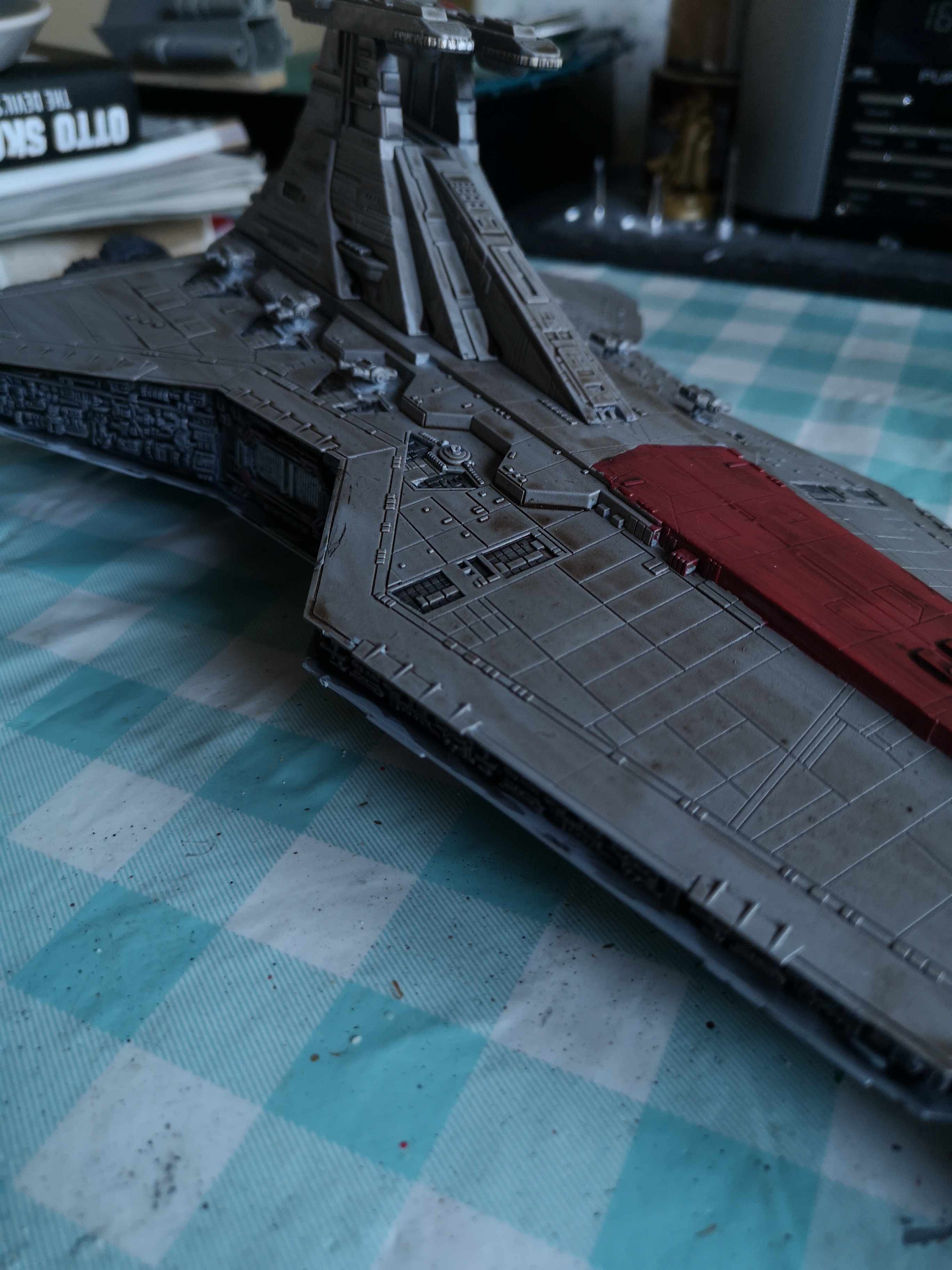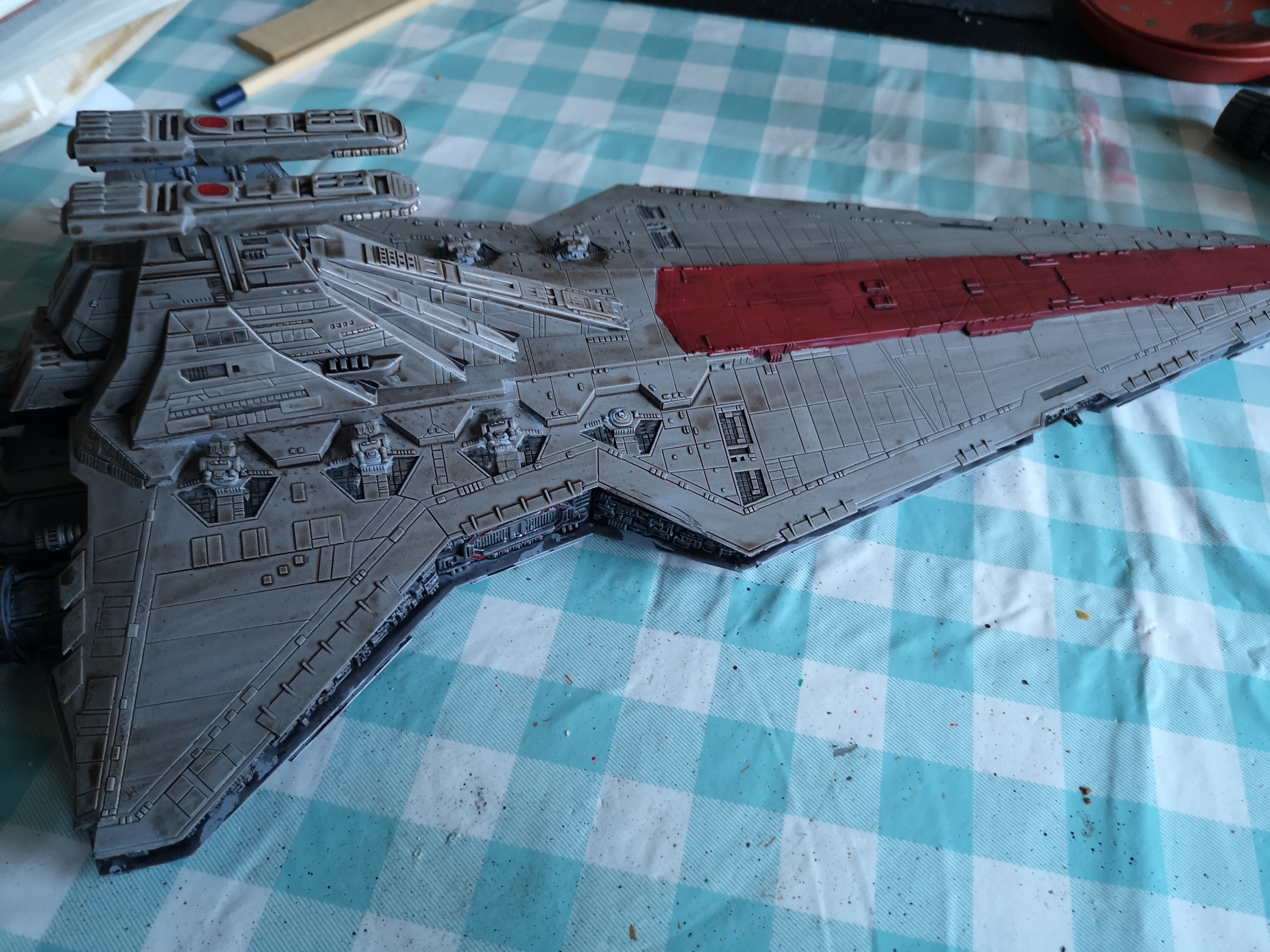 So February’s project on the modelling front is to finish the Revell Venator Star Destroyer from Revenge of the Sith and the Clone Wars series. This was always my favourite version of the Star Destroyer class ships which you see across the saga and I saved for ages for the model when it came out. Resources at the time and other matters meant I base coated it and then completely forgot about it until I moved home. Clearing the loft at my parents resulted in it being unearthed.